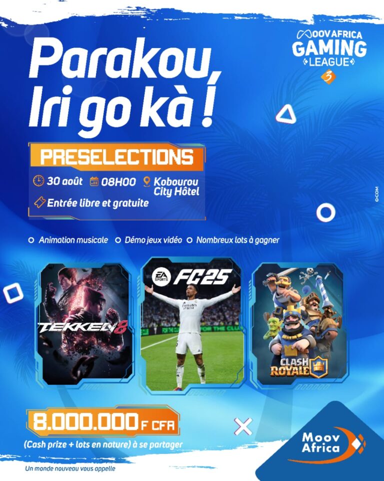 Moov Africa Bénin présente la troisième édition de Moov Gaming League, une compétition de gaming pour les passionnés de jeux vidéo. Pour cette 3ème édition, nous avons 3 jeux en compétition: TEKKEN 8, EA Sports FC 25 et Clash Royale.
