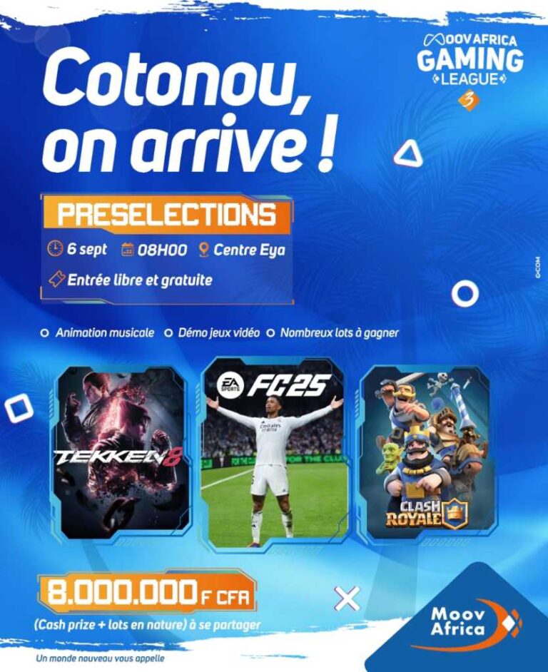 Moov Africa Bénin présente la troisième édition de Moov Gaming League, une compétition de gaming pour les passionnés de jeux vidéo. Pour cette 3ème édition, nous avons 3 jeux en compétition : TEKKEN 8, EA Sports FC 25 et Clash Royale.