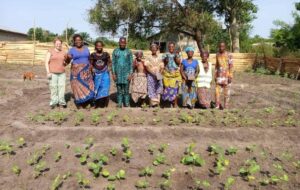 Des femmes de la FGFTL et responsables de l’ONG Monde Solidaire visitant le jardin potager témoin de Tchetti