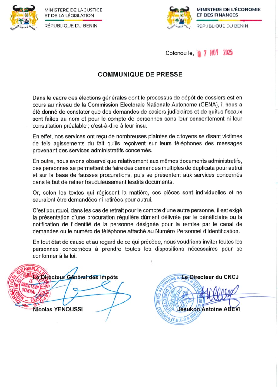 Selon ce communiqué, les deux institutions ont récemment reçu plusieurs plaintes de citoyens affirmant que des demandes de quitus fiscaux et de casiers judiciaires avaient été effectuées en leur nom sans leur autorisation. Dans plusieurs cas, ces personnes auraient même reçu des notifications officielles les informant du traitement ou de la délivrance de documents qu’elles n’avaient jamais sollicités.