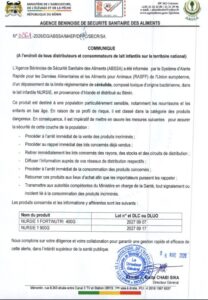 L’Agence Béninoise de Sécurité Sanitaire des Aliments (ABSSA) a lancé une alerte sanitaire concernant certains lots de lait infantile de la marque NURSIE, importés d’Irlande et commercialisés au Bénin.