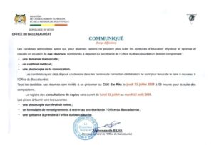 Selon le communiqué, le registre des consultations sera ouvert du 21 juillet au 12 août 2025. Cette opportunité permettra aux candidats de comprendre leurs erreurs et d’améliorer leurs résultats ou, au besoin, faire des réclamations.