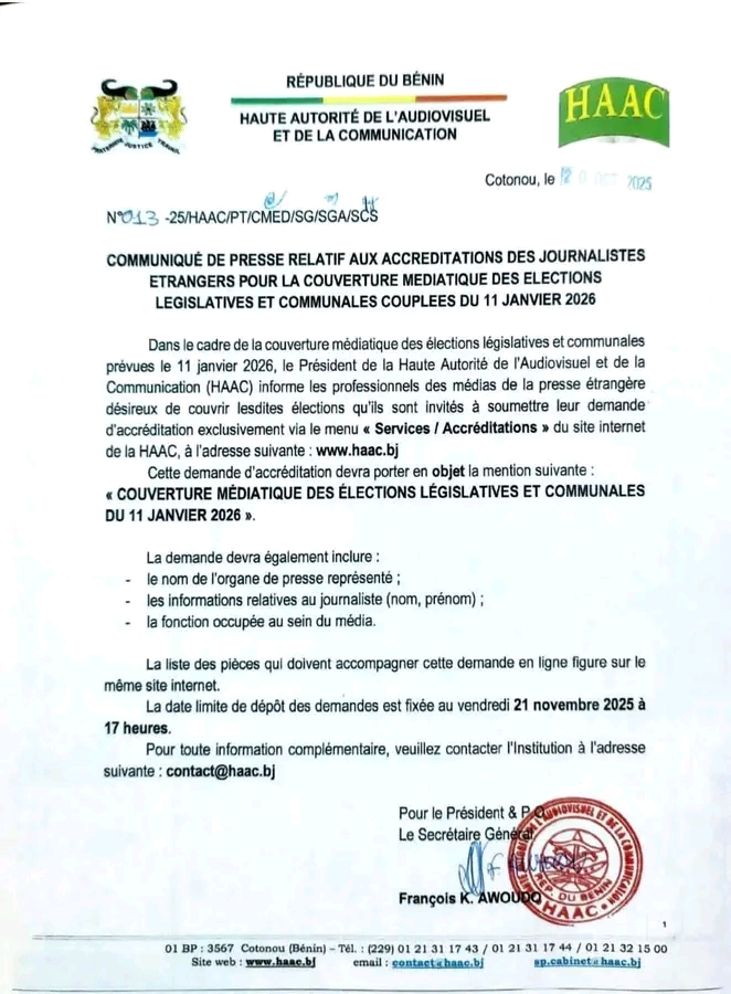 La Haute Autorité de l’Audiovisuel et de la Communication (HAAC) du Bénin a publié un communiqué à l’attention des professionnels des médias de la presse étrangère souhaitant assurer la couverture des prochaines élections communales et législatives de 2026.