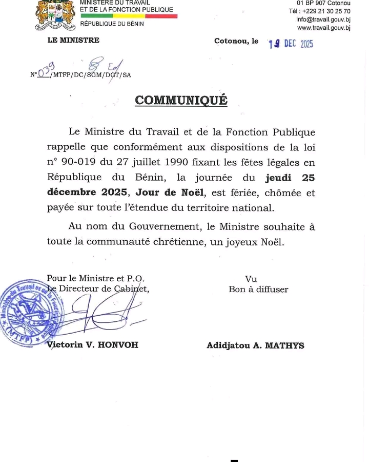 Dans un communiqué rendu public le 19 décembre 2025, le ministre du Travail et de la Fonction publique a rappelé que, conformément aux dispositions de la loi n°90-019 du 27 juillet 1990 fixant les fêtes légales en République du Bénin, la journée du jeudi 25 décembre 2025, correspondant à la célébration de la fête de Noël, est déclarée fériée, chômée et payée sur toute l’étendue du territoire national.