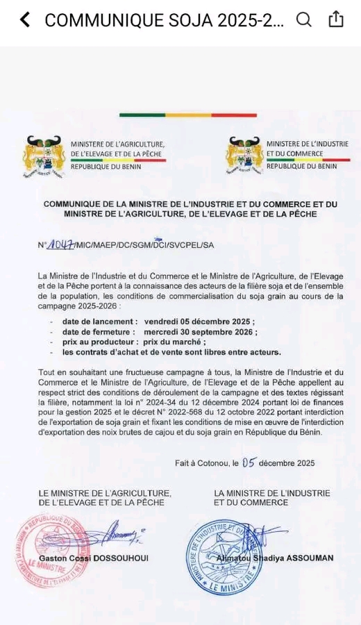 Le gouvernement béninois a annoncé, à travers un communiqué en date du 5 décembre 2025, l’ouverture officielle de la campagne de commercialisation du soja grain pour la période 2025-2026. Selon les ministres chargés de l’Industrie et du Commerce ainsi que de l’Agriculture, de l’Élevage et de la Pêche, cette campagne démarre ce vendredi 5 décembre 2025 et s’achèvera le 30 septembre 2026.