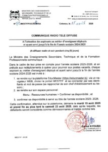 Dans un communiqué radio télé diffusé en date du lundi 18 août 2025, la Ministre des Enseignements Secondaires, Technique et de la Formation Professionnelle invite les Aspirants au Métier d’Enseignants (AME), à confirmer leur disponibilité pour servir au cours de l’année scolaire 2025-2026. La plateforme pour confirmer leur disponibilité est ouverte du mardi 19 au samedi 23 août 2025.