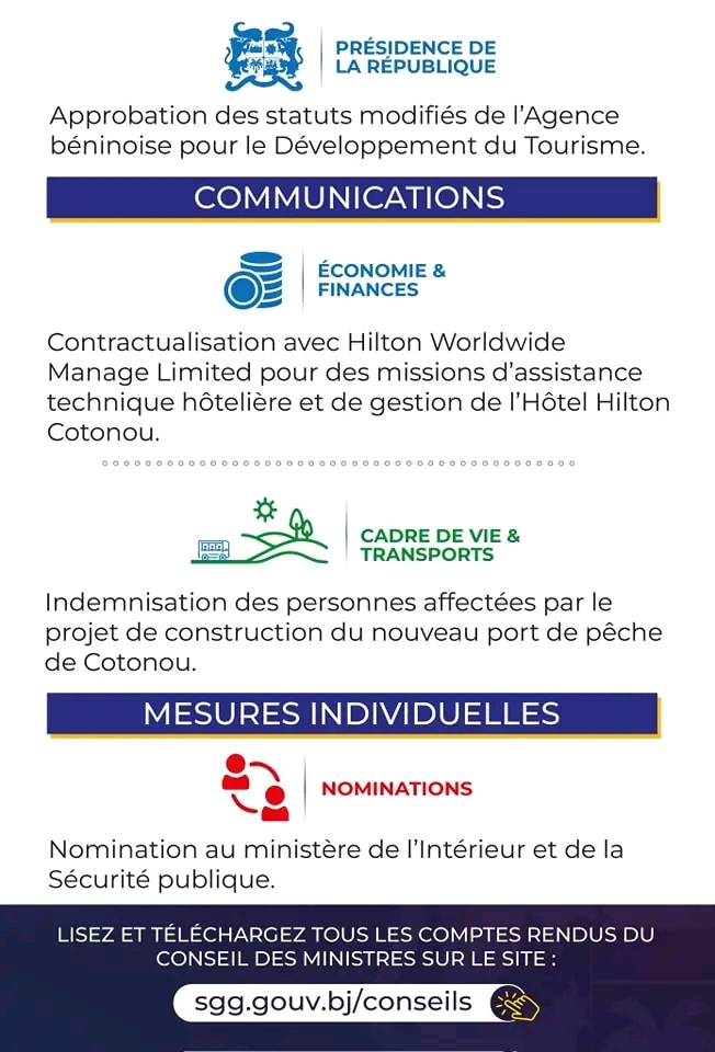 Les membres du gouvernement béninois sous la houlette du président Patrice Talon, se sont retrouvés ce mercredi 05 février 2025, pour leur réunion hebdomadaire. Au cours de cette séance, plusieurs décisions sont prises. Infographie récapitulative des grandes décisions du Conseil des ministres de ce jour.
