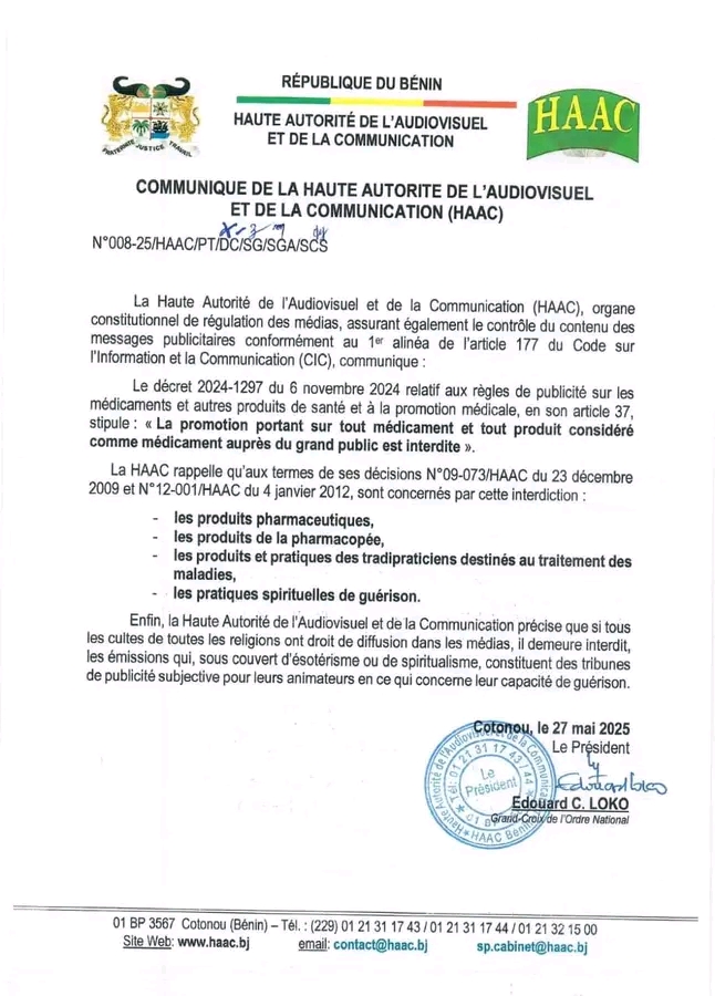Au Bénin, les publicités sur des produits pharmaceutiques, des produits de la pharmacopée, des produits et pratiques des tradipraticiens destinés au traitement des maladies, des pratiques spirituelles de guérison sont formellement interdites. A travers un communiqué en date du 27 mai, la Haute Autorité de l’Audiovisuel et de la Communication (HAAC), par son président Édouard Loko siffle la fin de la récréation.