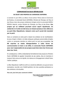 Après l’annonce officielle du limogeage de désormais ancien ministre de l’Energie , de l’Eau et des Mines Kingnidé Paulin AKPONNA, le parti politique Bloc Républicain sort un communiqué dans lequel il a pris ses responsabilités.