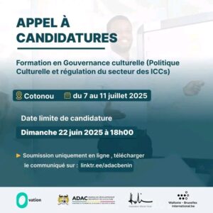 Dans le cadre du Programme Intégré (formation, incubation, sensibilisation) pour le renforcement de l’écosystème des Industries Culturelles et Créatives (PICC) au Bénin, l’Agence de Développement des Arts et de la Culture (ADAC), en partenariat avec la Fondation Marcel Hicter (FMH) et OVATION, avec le soutien de Wallonie-Bruxelles Internationale, met en œuvre le programme PICC-BENIN.