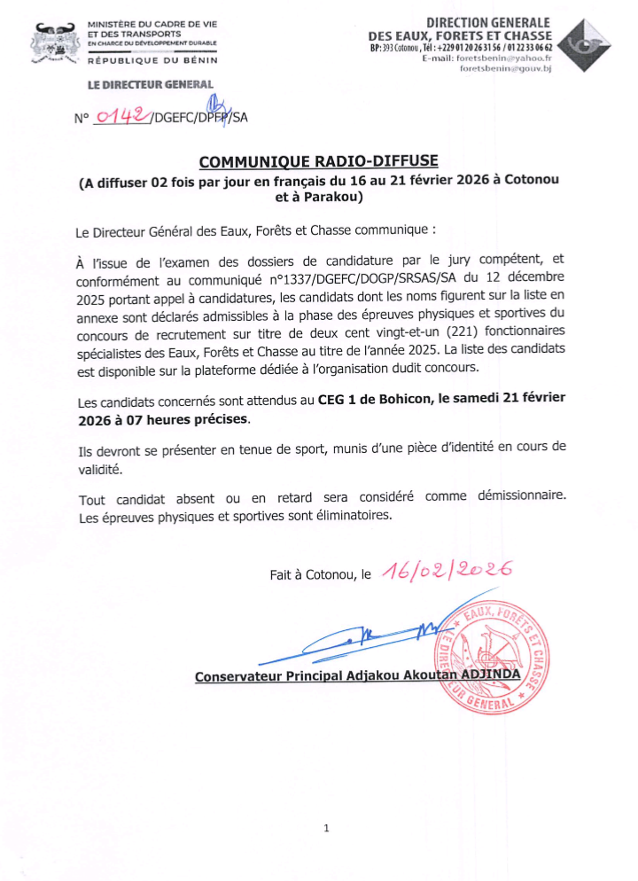 Le communiqué, signé à Cotonou le 16 février 2026 par le Conservateur Principal Adjakou Akoutan Adjinna, précise que la diffusion de cette information est prévue du 16 au 21 février 2026 à Parakou et à Cotonou, afin d’assurer une large mobilisation des candidats concernés.
