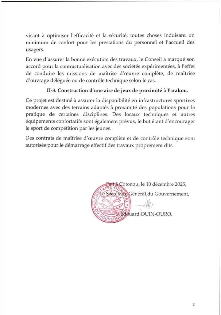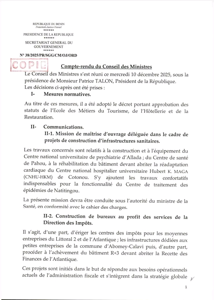 Le Conseil des ministres s’est tenu ce mercredi 10 décembre 2025 sous la présidence du chef de l’État, Patrice Talon. Au terme de la session, plusieurs décisions ont été adoptées.