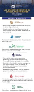 Home Actualité Conseil des ministres : les grandes décisions du gouvernement ce 11 mars... Actualité Conseil des ministres : les grandes décisions du gouvernement ce 11 mars 2026 By Narcisse - mars 11, 2026 200 0 FacebookTwitterPinterestWhatsApp Les décisions majeures issues du Conseil des ministres du mercredi 11 mars 2026 résumées en infographie👇