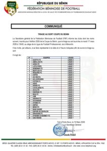 Dans une note officielle rendue publique, l’instance faîtière du football béninois invite les équipes concernées à prendre connaissance des documents relatifs à l’organisation du tirage ainsi que de la liste des clubs retenus pour participer à la compétition.