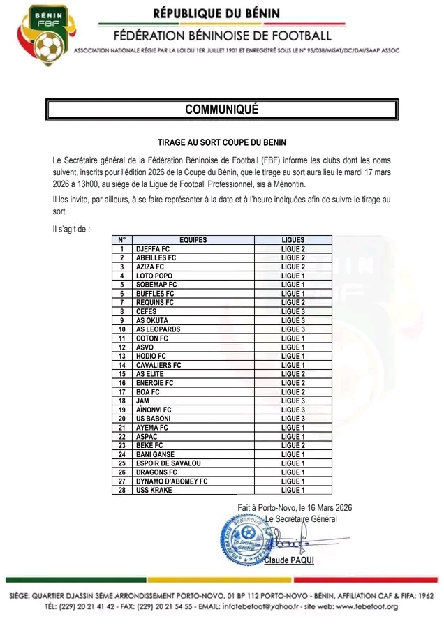 La Fédération Béninoise de Football annonce la tenue du tirage au sort de l’édition 2026 de la Coupe du Bénin. L’opération se déroulera le mardi 17 mars 2026 à partir de 13 heures au siège de la Ligue de Football Professionnel du Bénin, situé à Mènontin à Cotonou.