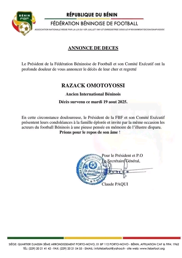 La Fédération Béninoise de Football (FBF) et l’ensemble du monde sportif béninois sont en deuil suite au décès de Razack Omotoyossi, survenu le 19 août 2025 à Lagos, au Nigeria.