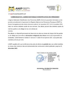 L’Agence Nationale d’Identification des Personnes (ANIP), informe à travers un communiqué en date du 30 octobre 2025, qu’elle procède à l’apurement du Registre National des Personnes Physiques (RNPP) par l’enregistrement des décès non encore déclarés survenus entre le 1er novembre 2017 et le 6 novembre 2025.