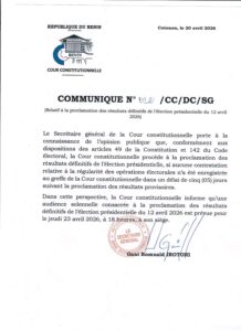 À Cotonou, la Cour constitutionnelle du Bénin a officiellement fixé le cap pour la proclamation des résultats définitifs de l’élection présidentielle du 12 avril 2026.