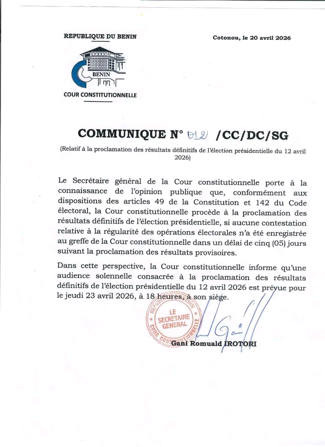 Dans un communiqué en date du 20 avril, le secrétaire général de l’institution, Monsieur Gani Romuald IROTORI rappelle que, conformément aux dispositions légales en vigueur, la publication des résultats définitifs intervient à l’issue d’un délai de cinq jours suivant l’annonce des résultats provisoires, à condition qu’aucun recours n’ait été enregistré.