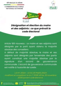 Selon les informations de Commission Électorale Nationale Autonome (CENA), le maire et ses adjoints sont désignés par le parti politique ayant obtenu la majorité absolue des conseillers communaux. Cette mesure vise à renforcer la stabilité et la cohérence dans la gestion des communes.