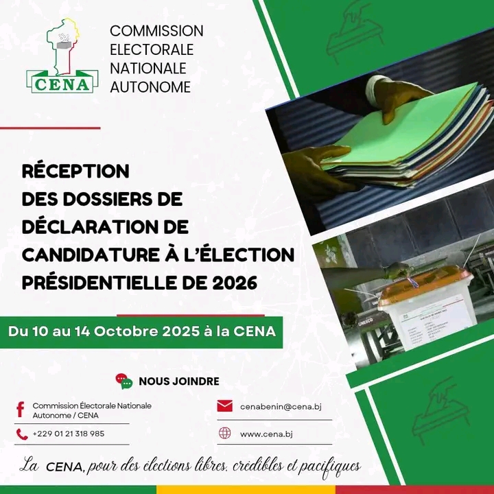 Au Bénin, la Commission Électorale Nationale Autonome (CENA) a officiellement ouvert, ce vendredi 10 octobre 2025, la phase de réception des dossiers de déclaration de candidature à l’élection présidentielle prévue pour 2026. Cette étape cruciale du processus électoral marque le début d’une série d’opérations techniques et administratives conduisant à la validation des candidatures.