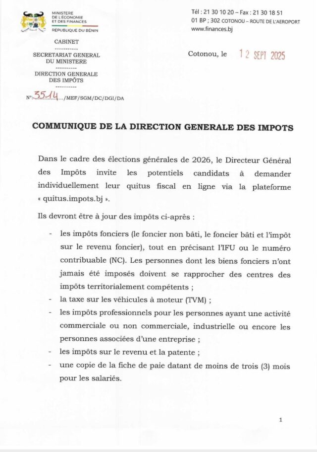 Dans un communiqué en date du 12 septembre 2026, le Directeur Général des Impôts a invité les potentiels candidats aux élections générales de 2026 à demander individuellement leur quitus fiscal en présentiel ou en ligne via la plateforme https://quitus.impots.bj