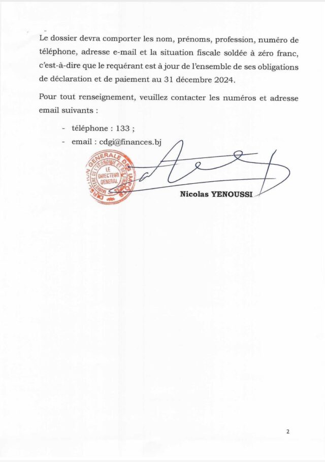 « Le dossier devra comporter les nom, prénoms, profession, numéro de téléphone et la situation fiscale soldée à zéro francs, c’est-à-dire que le requérant est à jour de l’ensemble de ses obligations de déclaration et de paiement au 31 décembre 2024 », renseigne le communiqué.