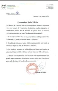 Ces dispositions, applicables sur toute l’étendue du territoire national, visent à garantir la sécurité, la paix et le bon déroulement du scrutin. Ainsi, la tenue des marchés ainsi que toute manifestation publique est interdite le dimanche 11 janvier 2026, de 06 heures à 20 heures.