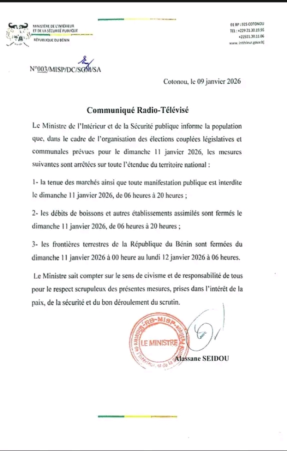 Dans un communiqué radio-télévisé en date du 9 janvier 2026, le ministre béninois de l’Intérieur et de la Sécurité publique, Alassane Seidou, a porté à la connaissance de la population les mesures arrêtées par le gouvernement dans le cadre de l’organisation des élections législatives et communales prévues pour le dimanche 11 janvier 2026.