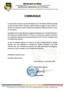 La Fédération Béninoise de Football (FBF) a, dans un communiqué publié le 28 octobre 2025, adressé ses félicitations au staff technique et à l’ensemble de l’équipe nationale féminine pour leur performance lors du match retour du dernier tour des éliminatoires de la Coupe d’Afrique des Nations féminine 2026.
