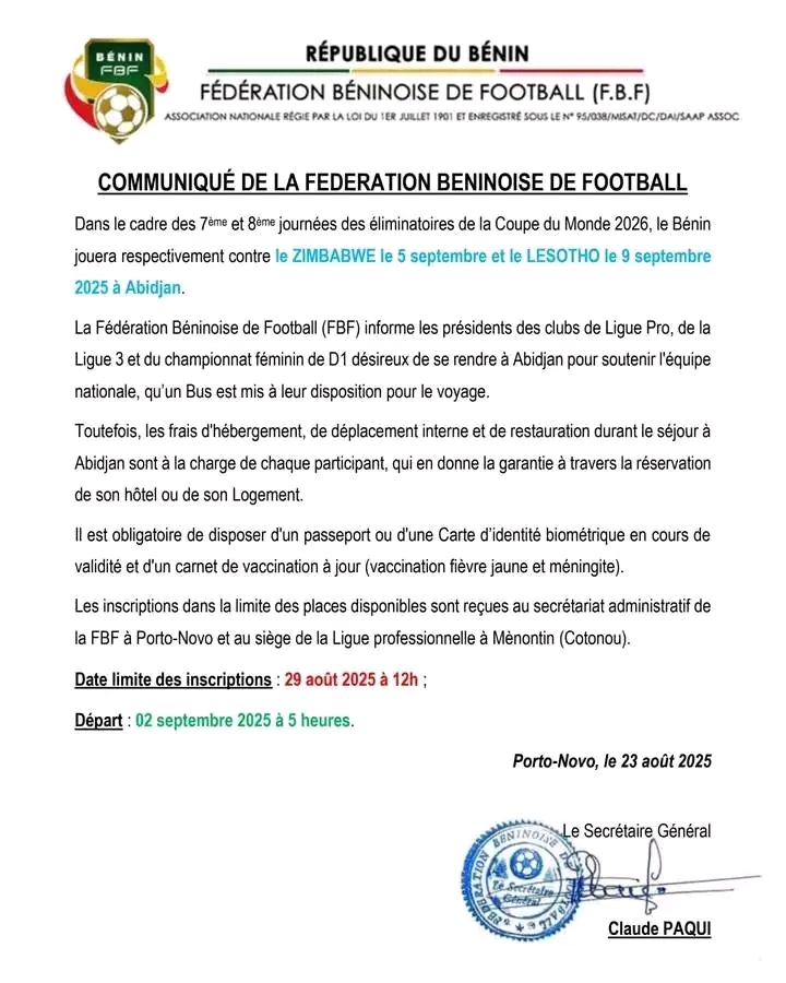 Cette annonce a été faite dans un communiqué en date du 23 août 2025, et signé par le secrétaire général de la fédération Claude Paqui. En effet, il est obligatoire d’avoir un passeport ou une carte d’identité biométrique en cours de validité et d’un carnet de vaccination à jour, avant d’être éligible pour le voyage.