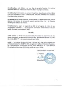 Lire l’intégralité de la Décision n°26-009/HAAC du 25 mars 2026👇