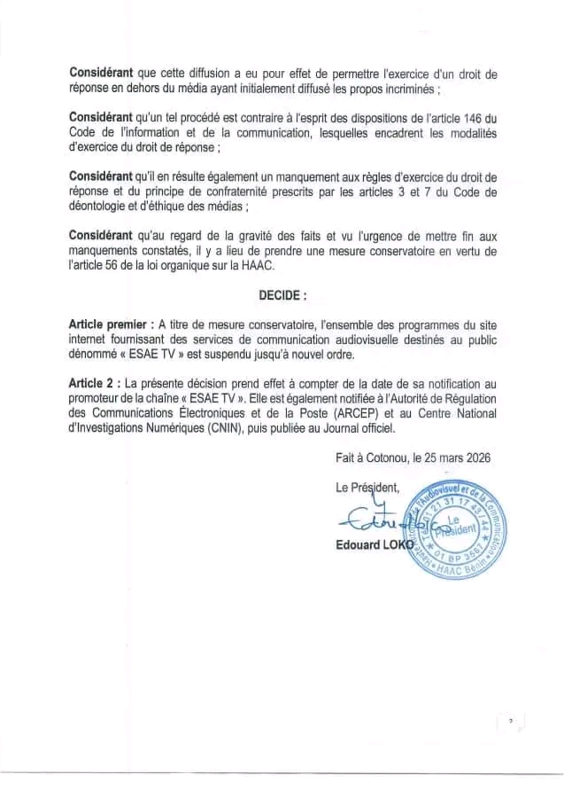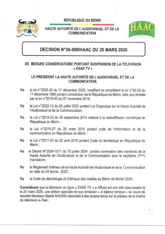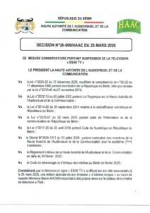 La Haute Autorité de l’Audiovisuel et de la Communication (HAAC) a décidé de suspendre, jusqu’à nouvel ordre, l’ensemble des programmes diffusés par la télévision en ligne « ESAE TV ». Cette mesure conservatoire intervient en raison de faits qualifiés de graves par l’organe de régulation, qui entend ainsi préserver le respect des règles encadrant la communication audiovisuelle au Bénin.