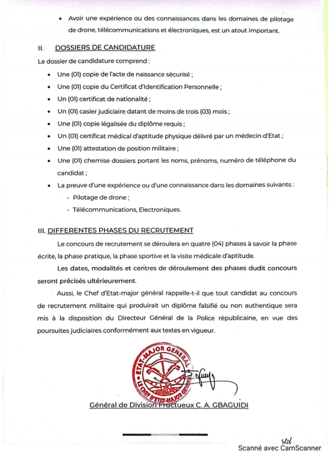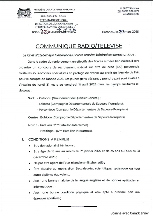 Dans le cadre du renforcement en effectifs des Forces armées béninoises, le Chef d’État-major Général des Forces armées béninoises communique qu’il sera organisé un concours de recrutement spécial sur titre de cent (100) personnels militaires sous-officiers spécialisés en pilotage de drone et pour l’Armée de l’air, pour le compte de l’année 2025. Les jeunes gens désirant y prendre part sont invités à s’inscrire du lundi 31 mars au vendredi 11 avril 2025 dans les camps militaires sélectionnés.