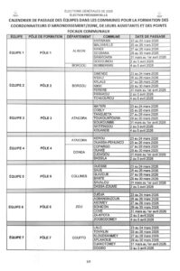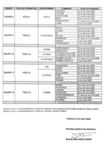 Dans le cadre des préparatifs liés aux prochaines échéances, le calendrier officiel de passage des équipes chargées de la formation des acteurs de terrain est désormais connu. Cette opération vise spécifiquement les coordonnateurs d’arrondissement et de zone, leurs assistants ainsi que les points focaux communaux, acteurs clés du dispositif organisationnel sur le terrain.