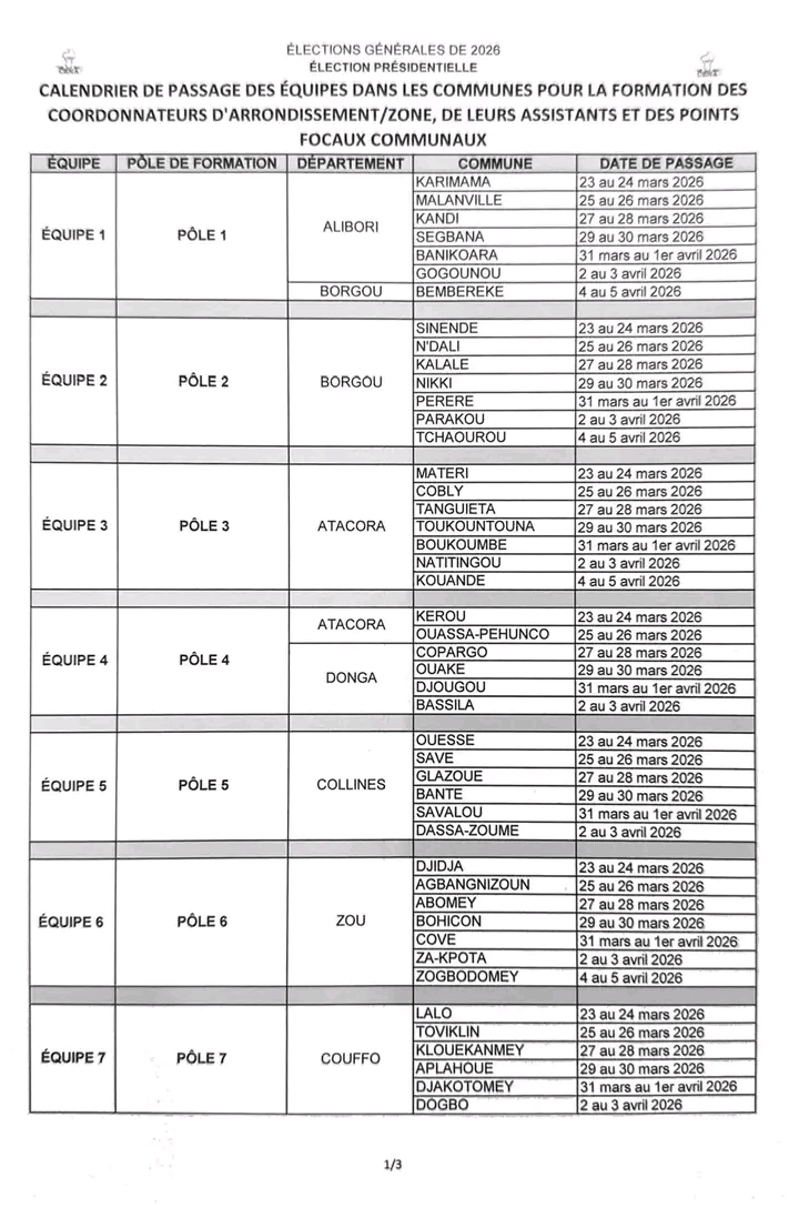 Dans le cadre des préparatifs liés aux prochaines échéances, le calendrier officiel de passage des équipes chargées de la formation des acteurs de terrain est désormais connu. Cette opération vise spécifiquement les coordonnateurs d’arrondissement et de zone, leurs assistants ainsi que les points focaux communaux, acteurs clés du dispositif organisationnel sur le terrain.