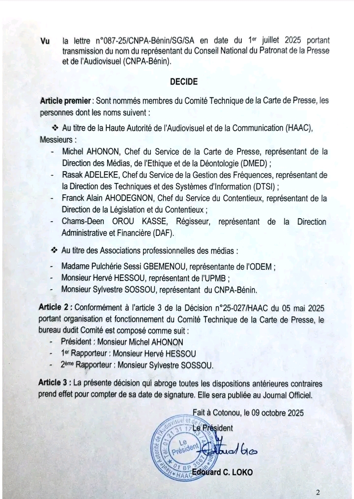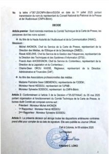 Lire ci-dessous l’intégralité de la décision portant nomination des membres du comité technique de la carte de presse et les membres nommés 👇