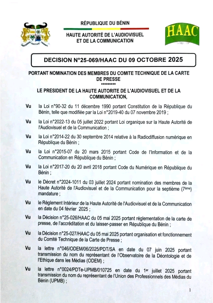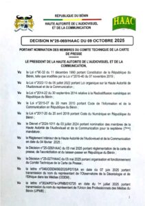 Le Haute Autorité de l’Audiovisuel et de la Communication (HAAC) du Bénin a procédé à la nomination des membres du comité technique chargé de la « Carte de presse ». Ce comité a pour mission d’examiner les dossiers des professionnels des médias et de statuer sur l’attribution, le renouvellement ou la gestion des cartes de presse délivrées aux journalistes.