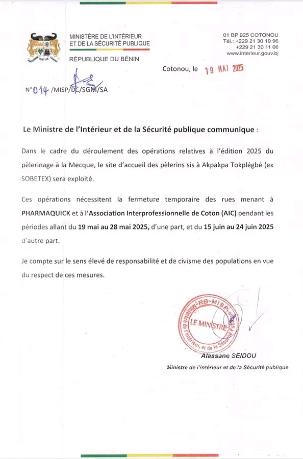 Dans le cadre du déroulement des opérations relatives à l’édition 2025 du pèlerinage à la Mecque, le Ministre de l’Intérieur et de la Sécurité Publique, Alassane Seidou, à travers un communiqué en date du 19 mai 2025, porte à la connaissance de tous que le site d’accueil des pèlerins sis à Akpakpa Tokplégbé, ex SOBETEX sera exploité. A cet effet, le ministre annonce la fermeture temporaire des rues menant à PHARMAQUICK et à l’Association Interprofessionnelle du Coton (AIC) pendant les périodes allant du 19 au 28 mai 2025 d’une part, et du 15 au 24 juin 2025 d’autre part.