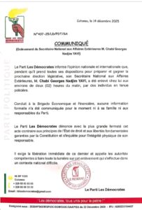 Le parti d’opposition béninois Les Démocrates a confirmé, dans un communiqué publié ce dimanche 14 décembre 2025, l’interpellation de son secrétaire national aux affaires étrangères, Chabi Georges Nadjim Yayi. La formation politique qualifie les faits « d’enlèvement » et exige sa « libération immédiate ».