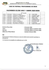 Au Bénin, le calendrier officiel de Celtiis Ligue 1, Saison 2025-2026 a été dévoilé. La Fédération Béninoise de Football, avec le soutien du Ministère des Sports et de CELTIIS, a officiellement rendu public le calendrier de la saison.