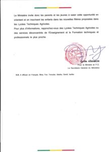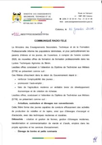 Le Ministère des Enseignements Secondaire, Technique et de la Formation Professionnelle annonce l’ouverture, au titre de l’année scolaire 2026, de nouvelles offres de formation innovantes dans les Lycées Techniques Agricoles à travers le pays.