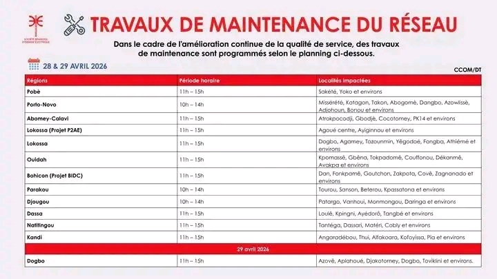 Selon le planning communiqué, ces interventions, inscrites dans le cadre de l’amélioration de la qualité de service, entraîneront des perturbations entre 10h et 15h dans plusieurs localités, notamment Pobè, Porto-Novo, Abomey-Calavi, Lokossa, Ouidah, Bohicon, Parakou, Djougou, Dassa, Natitingou, Kandi et Dogbo.