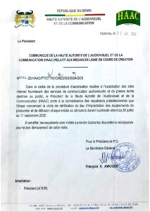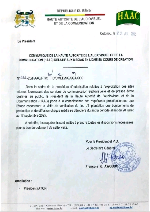 Par une décision en date du 23 juillet 2025, la Haute Autorité de l’audiovisuel et de la Communication du Bénin (HAAC) informe les requérants présélectionnés dans le cadre de la procédure d’autorisation relative à l’exploitation des sites internet fournissant des services de communication audiovisuelle et de la presse écrite destinés au public, qu’une opération de vérification du lieu d’implantation des équipements de production et de diffusion de chaque média démarrera dans ce mois de juillet 2025.