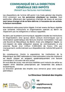 Ci-dessous, l’intégralité du communiqué de la Direction Générale des Impôts du Bénin 👇