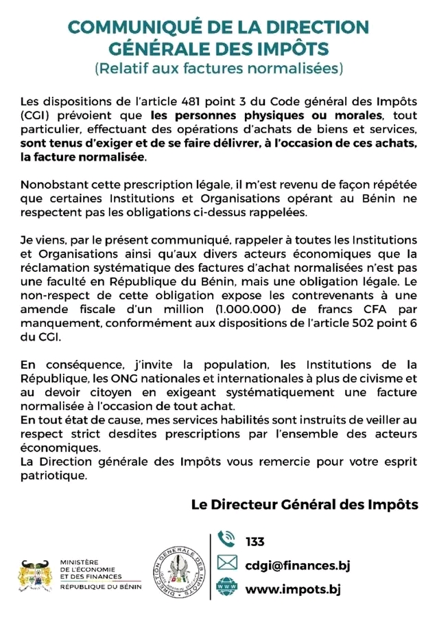 A travers un communiqué, la Direction Générale des Impôts du Bénin (DGI) rappelle à toutes les Institutions et Organisations ainsi qu’aux divers acteurs économiques que la réclamation systématique des factures d’achat normalisées n’est pas une faculté en République du Bénin, mais une obligation légale. En effet, le non-respect de cette obligation expose les contrevenants à une amende fiscale d’un million (1.000.000) de francs CFA par manquement, conformément aux dispositions de l’article 502 point 6 du CGI.