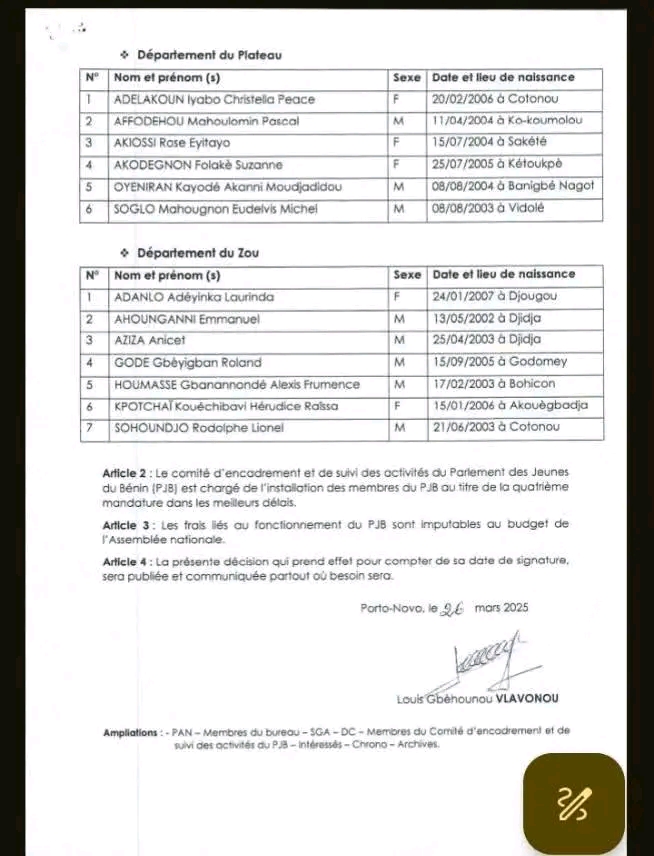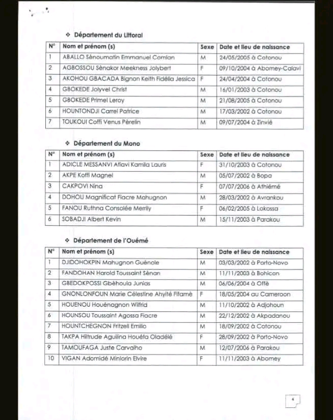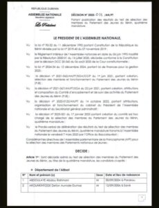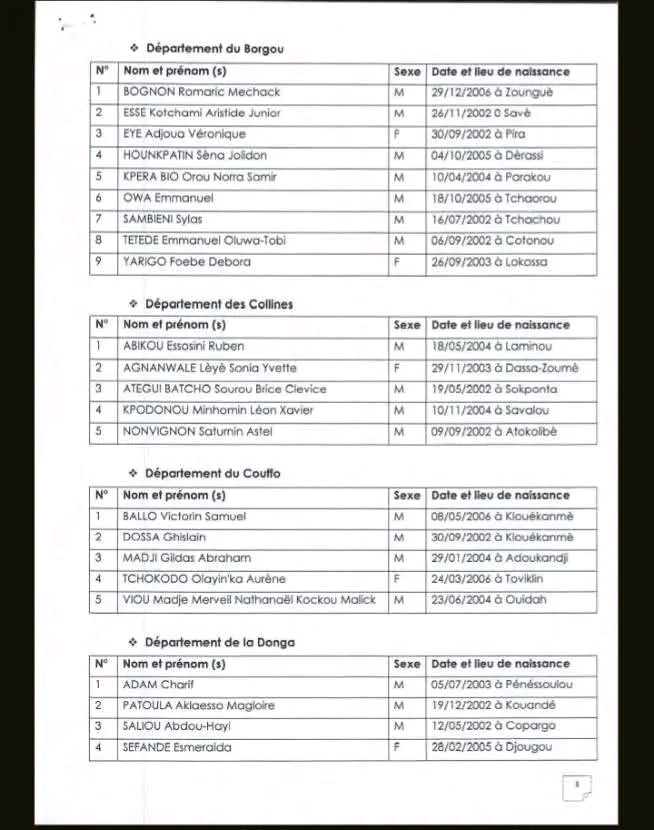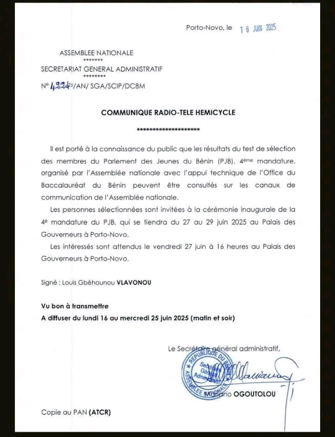 Dans le cadre de la mise en place du Parlement des Jeunes du Bénin, 4ème Mandature, l’Assemblée nationale du Bénin a lancé il y a quelques mois un appel à candidatures. Après la phase de présélection, les résultats définitifs du concours organisé par l’Assemblée nationale avec l’appui technique de l’Office du Bac sont disponibles.