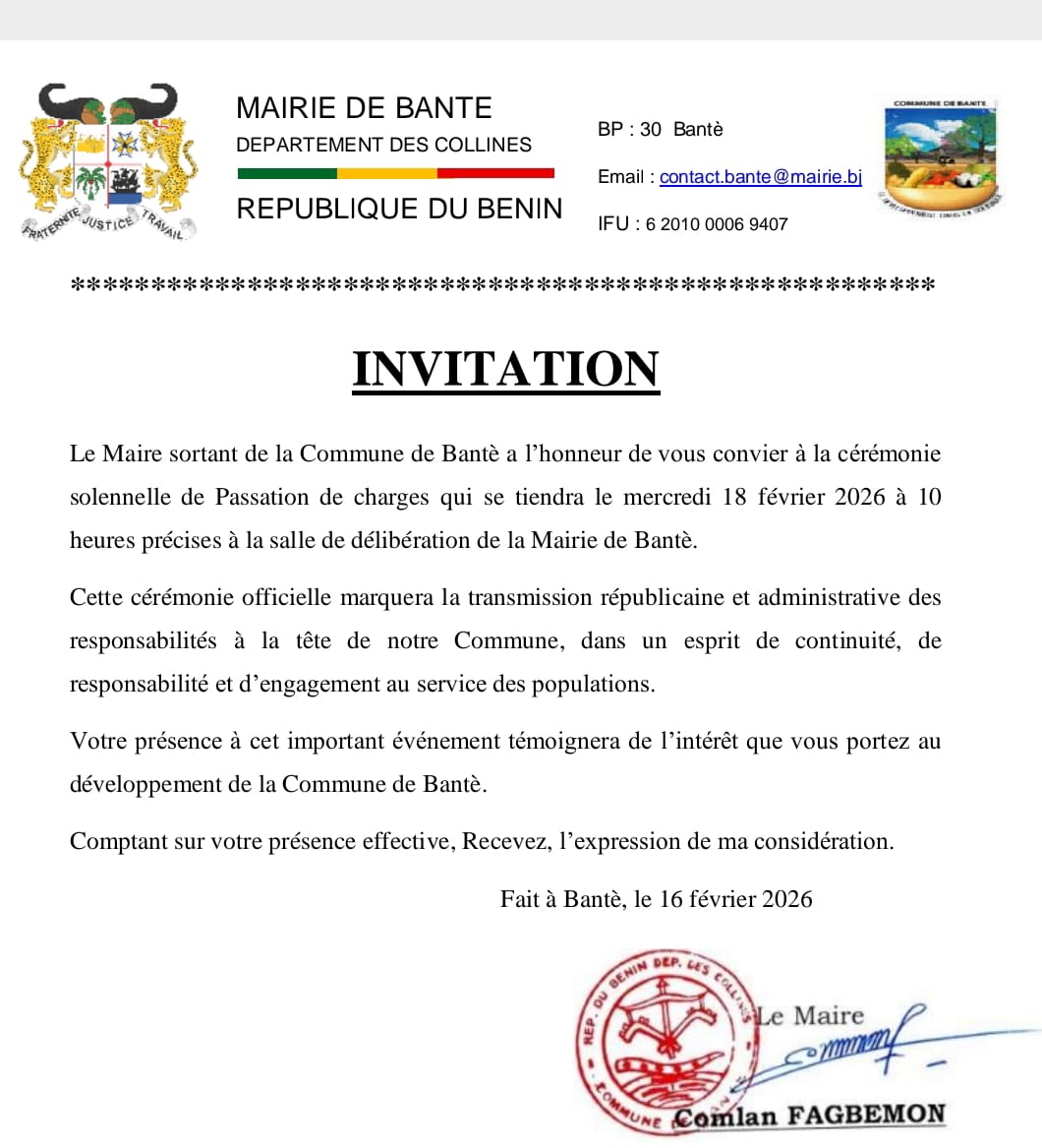 La transition à la tête de la commune de Bantè entre dans sa phase officielle. Le maire sortant, Comlan FAGBEMON, convie autorités, partenaires et populations à la cérémonie solennelle de passation de charges, prévue le mercredi 18 février 2026 à 10 heures précises dans la salle de délibération de la mairie.
