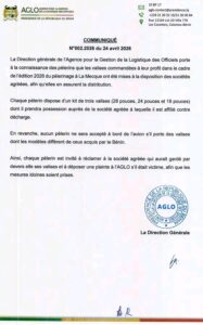 Ces équipements, spécialement commandés au profit des fidèles, seront distribués par des sociétés dûment agréées, chargées d’en assurer la remise dans les meilleures conditions. L’AGLO précise que cette organisation vise à garantir une gestion efficace et transparente de la logistique, tout en facilitant les préparatifs des pèlerins béninois.