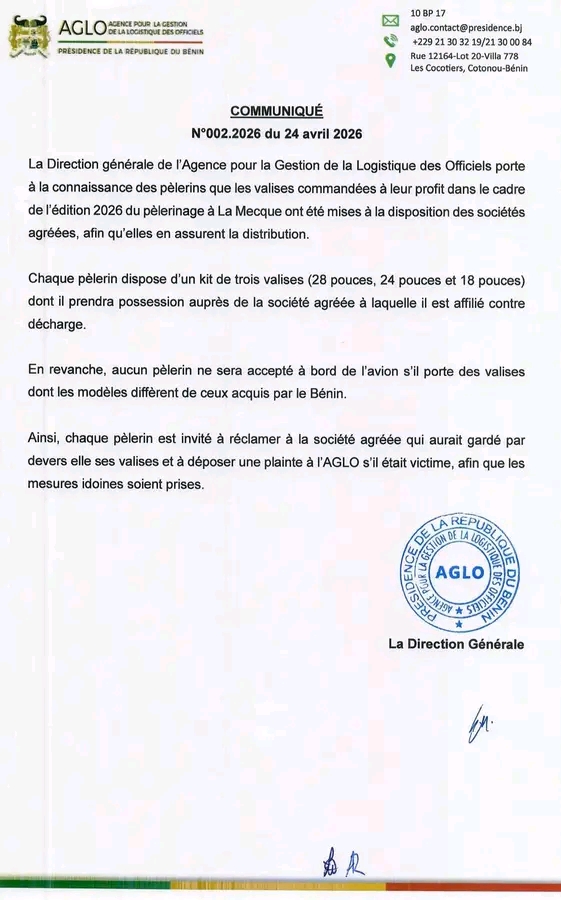 Dans un communiqué officiel, la Direction générale de l’Agence pour la Gestion de la Logistique des Officiels (AGLO) informe de la mise à disposition des valises destinées aux pèlerins de l’édition 2026 du pèlerinage à la Mecque.